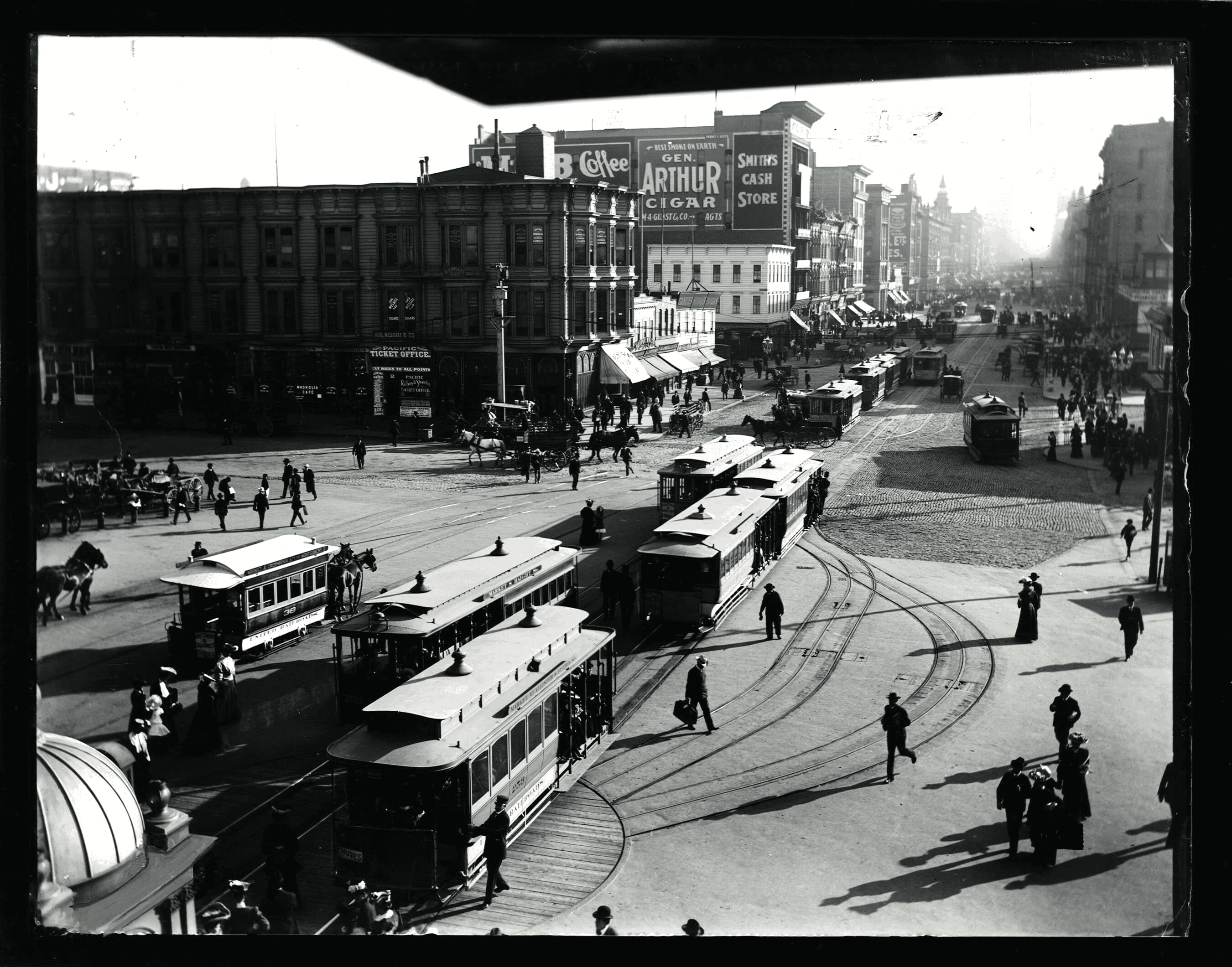 With the construction of the Ferry Building in 1896, new transportion modes begin to occupy Market St at its front.