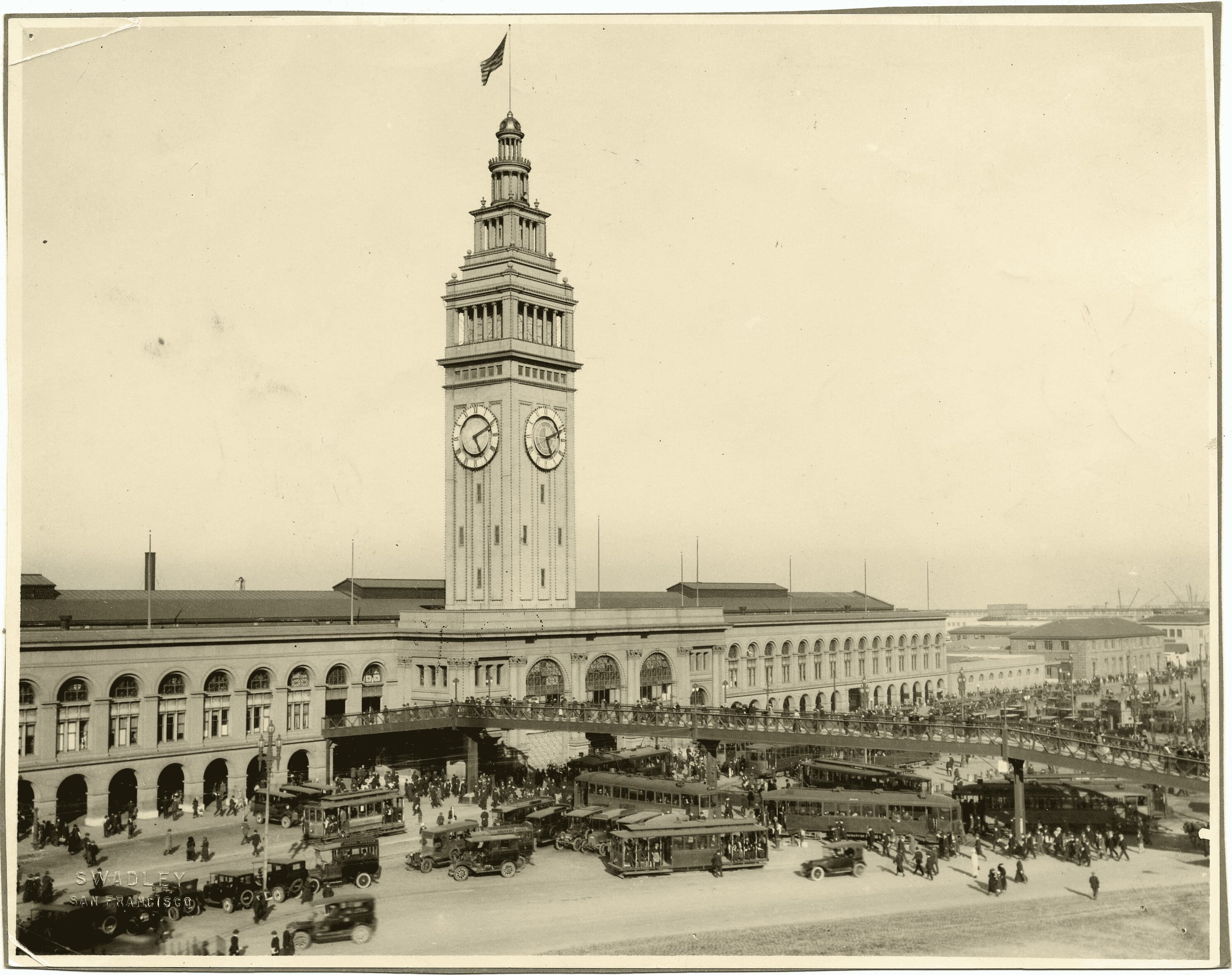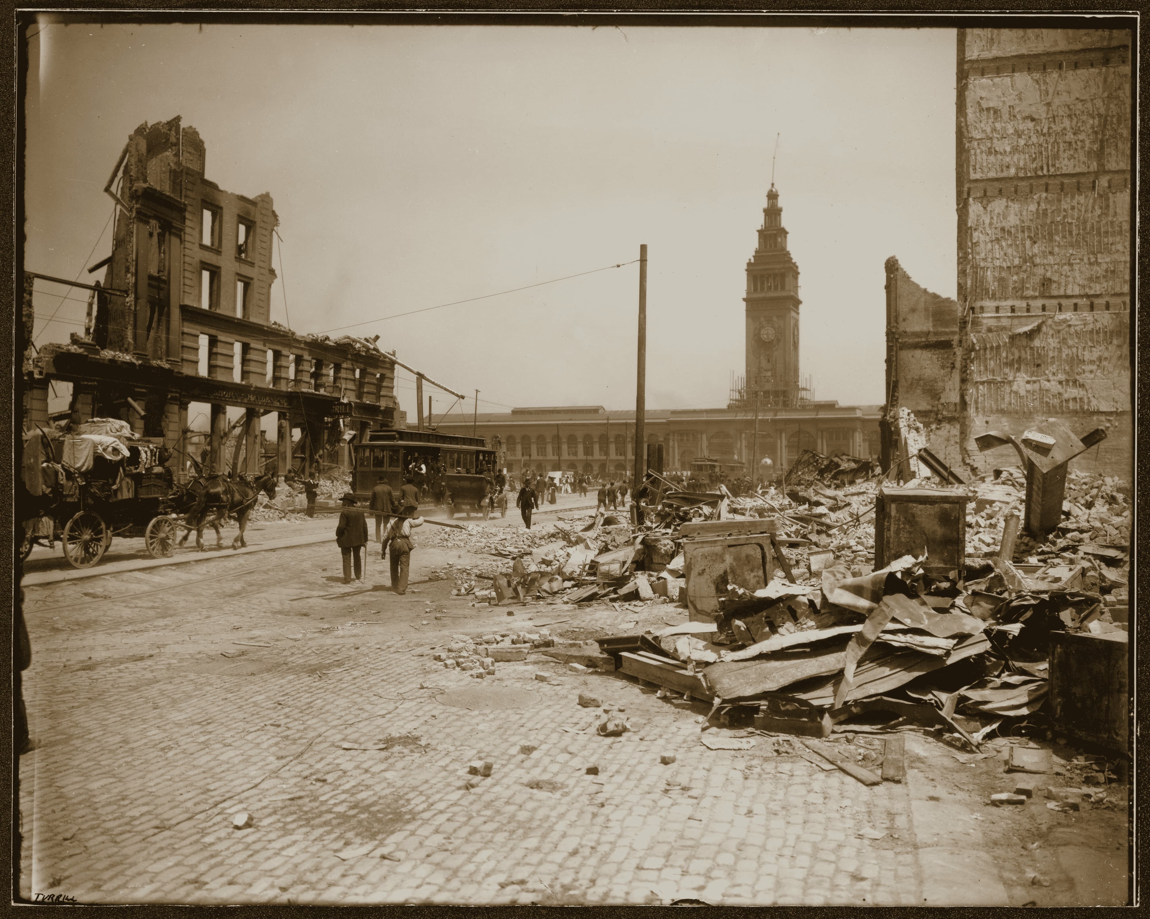 The 1906 earthquake devastates much of the city, yet the Ferry Building stands.