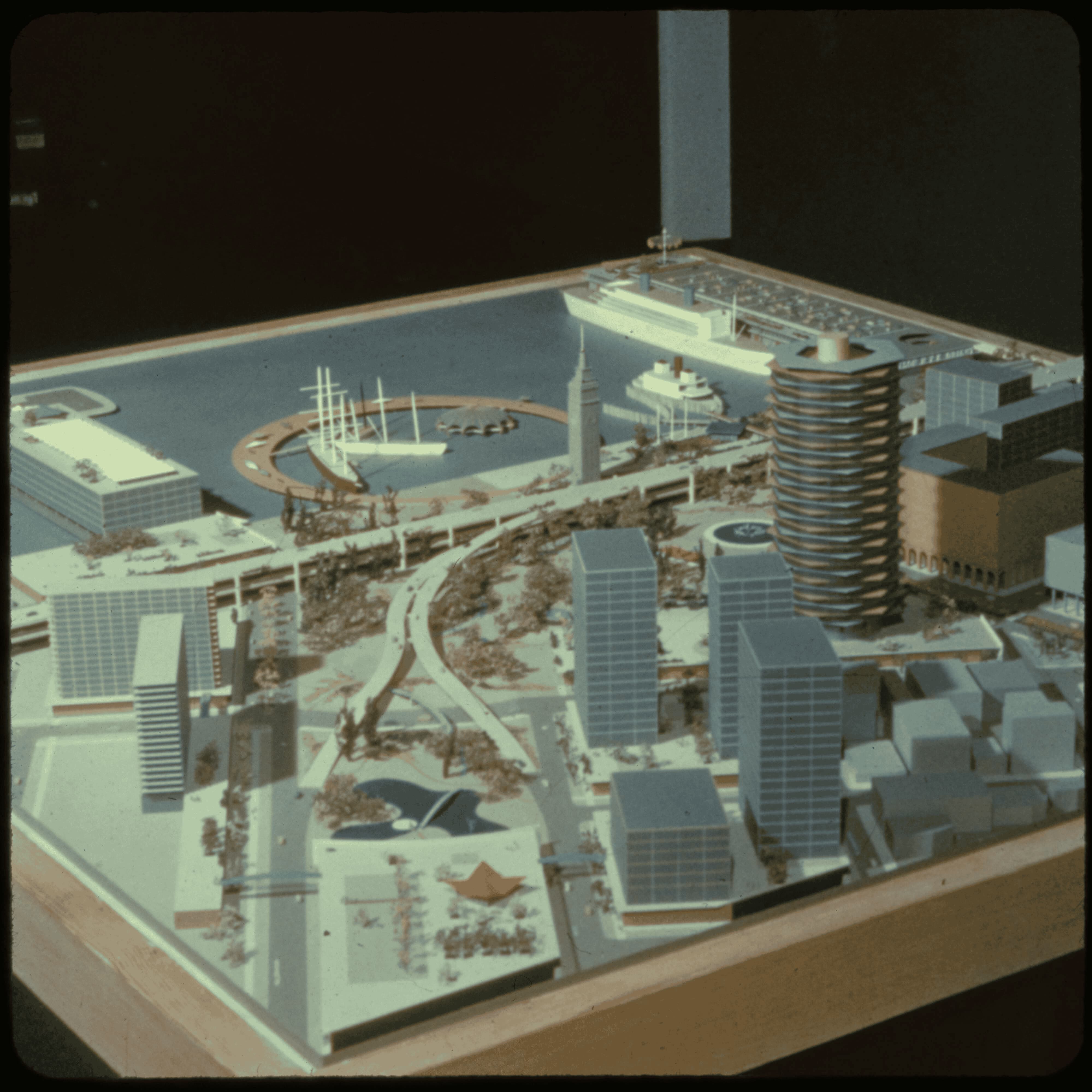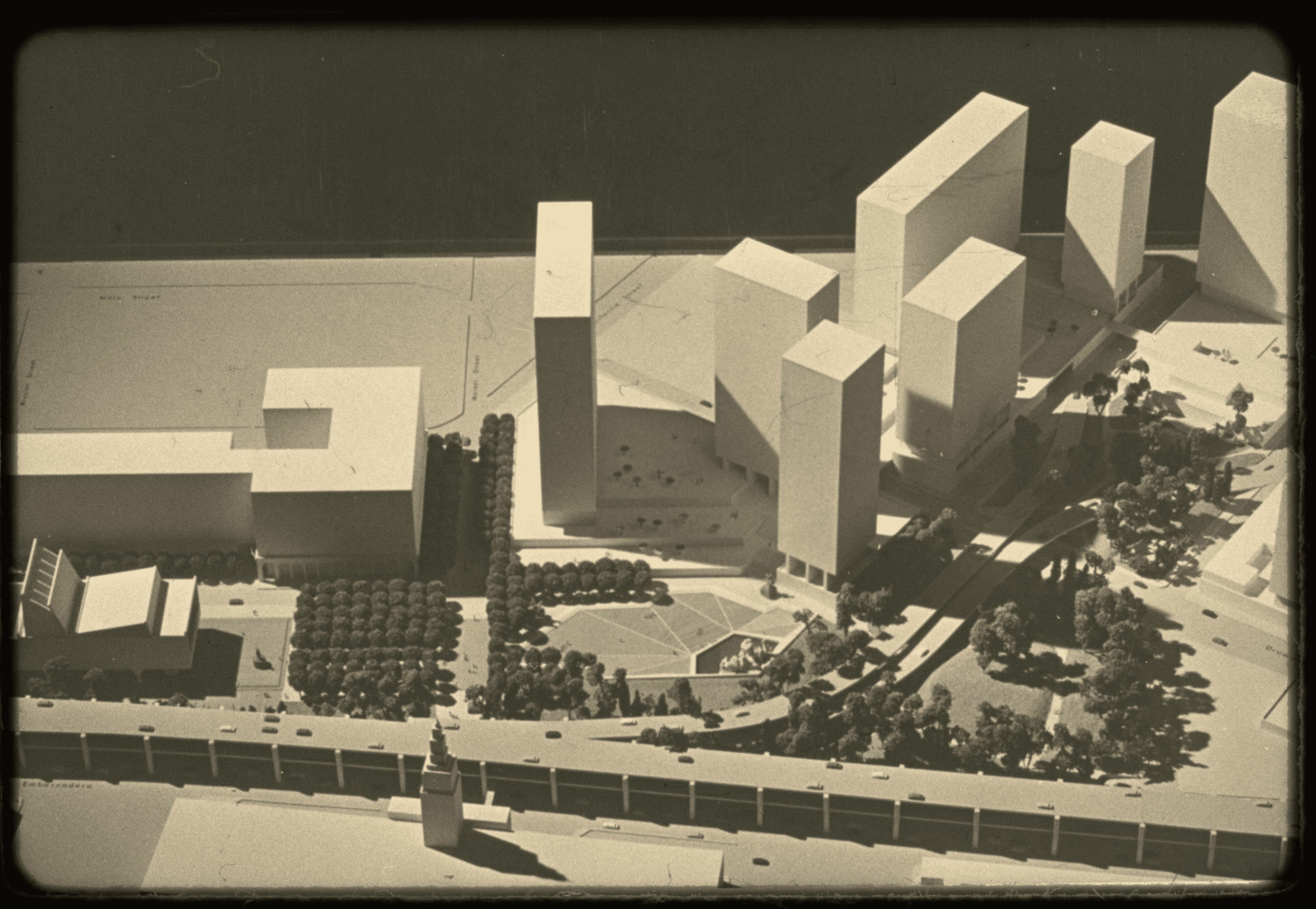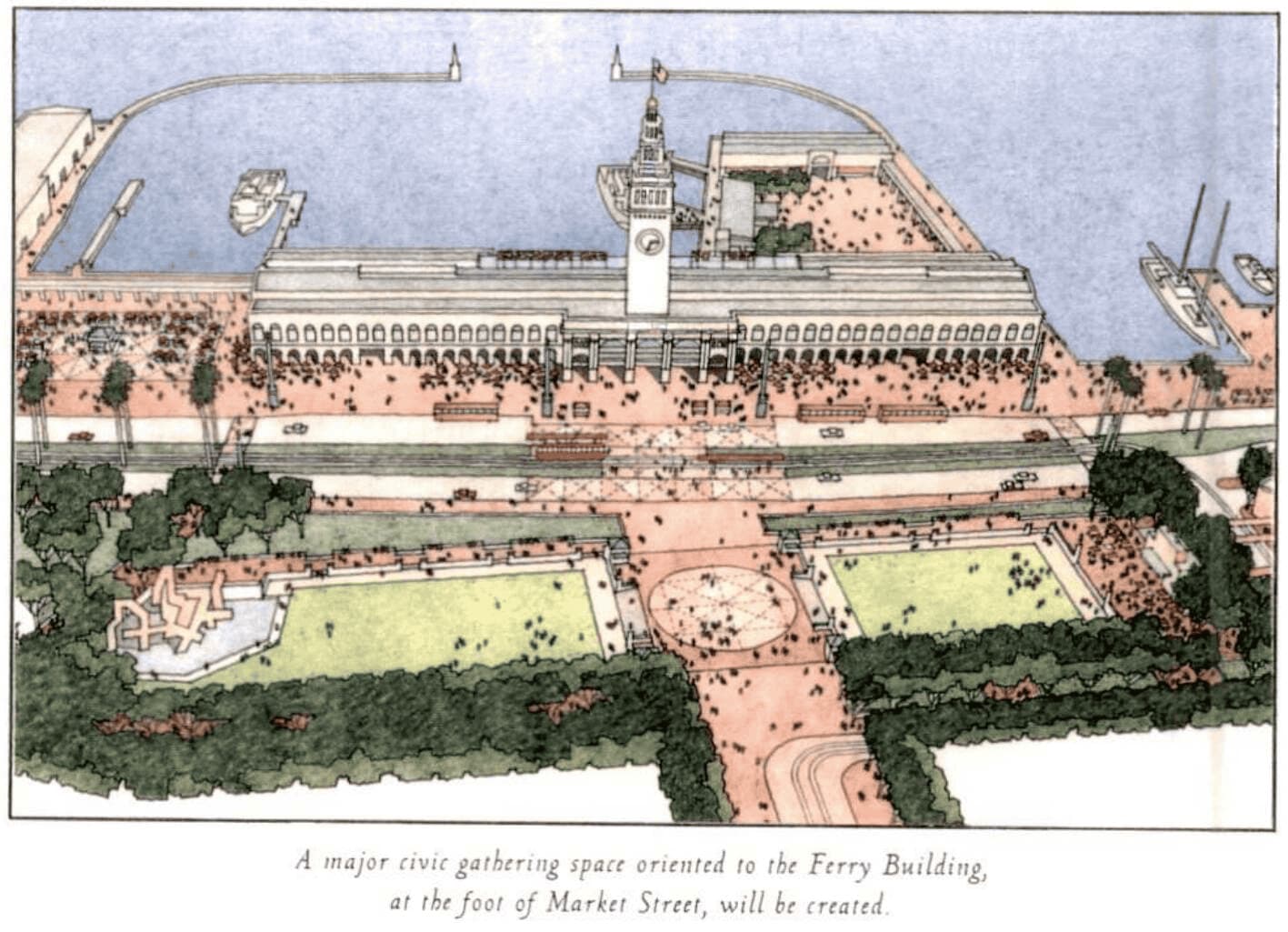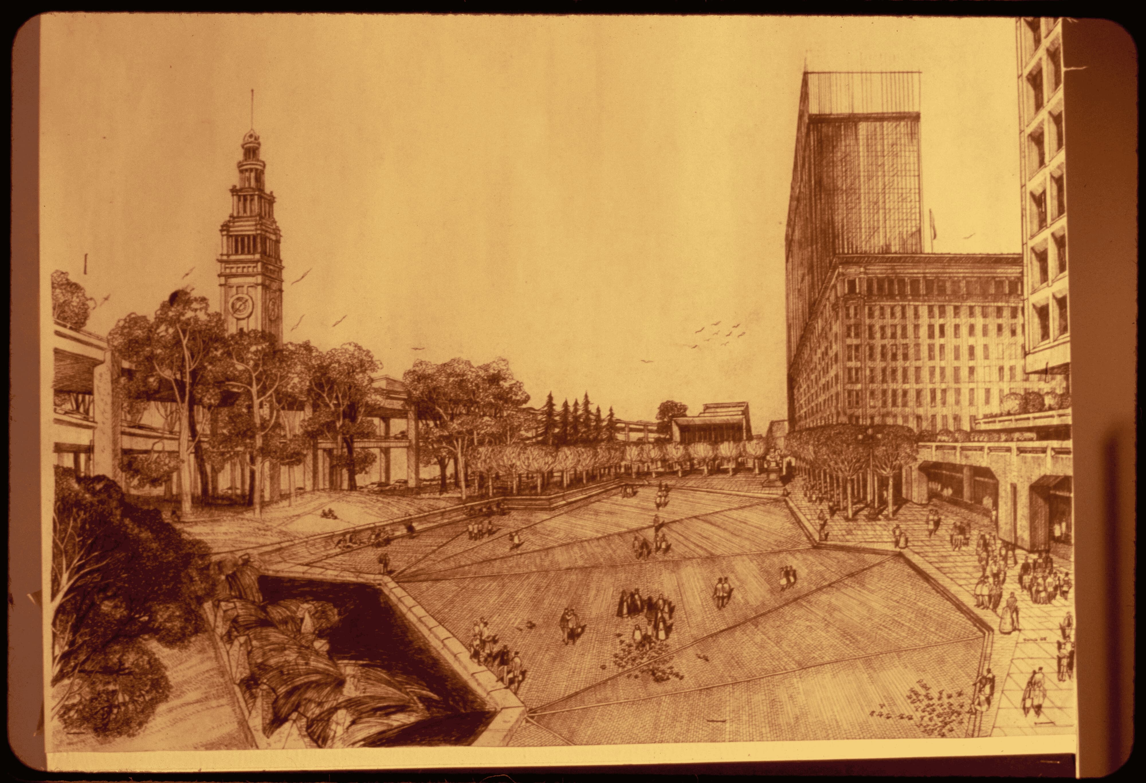 Early models are highly futuristic and call for the demolition of the Ferry Building, leaving only its central tower.