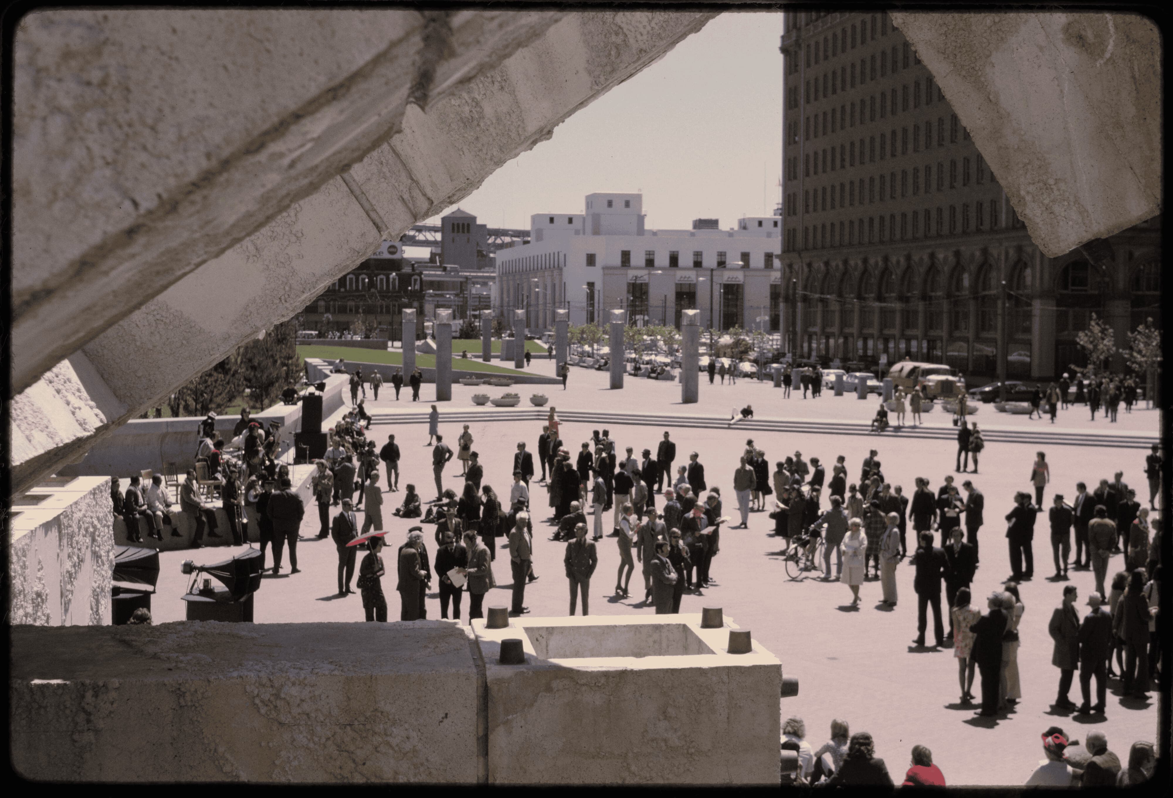 It features the European piazza-inspired bricks, angled grass seating, dynamic geometry, and the iconic Vaillancourt Fountain. The plaza was designed by Lawrence Halprin & Associates in a joint venture with Mario Ciampi & Associates and John Bolles & Associates.